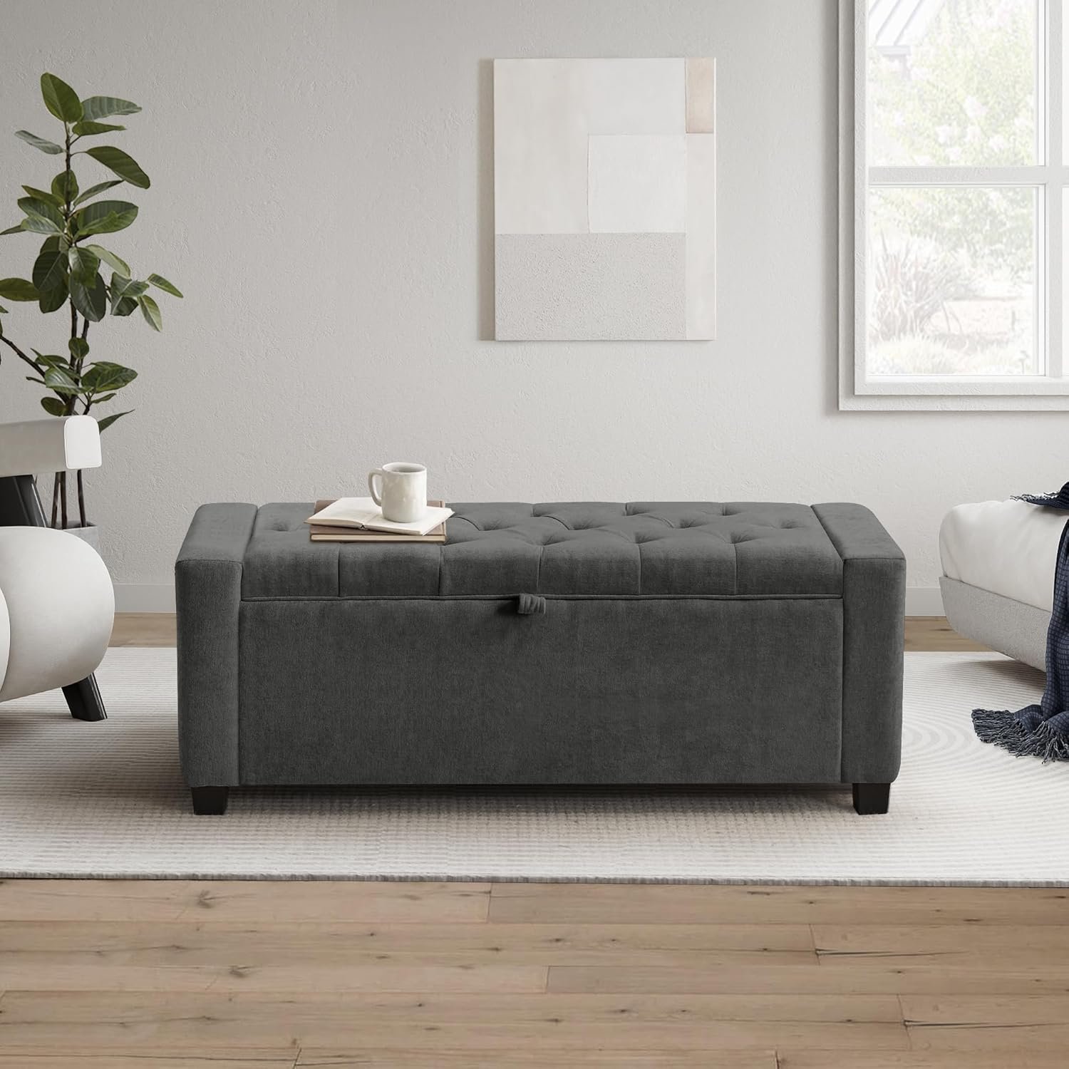 Featuring a classic rectangular silhouette, this storage bench is upholstered in timeless diamond-quilted fabric with decorative buttons. The textured design not only elevates your home decor but also promotes better air circulation for enhanced comfort. A minimalist built-in handle allows for easy lid access to your stored items.