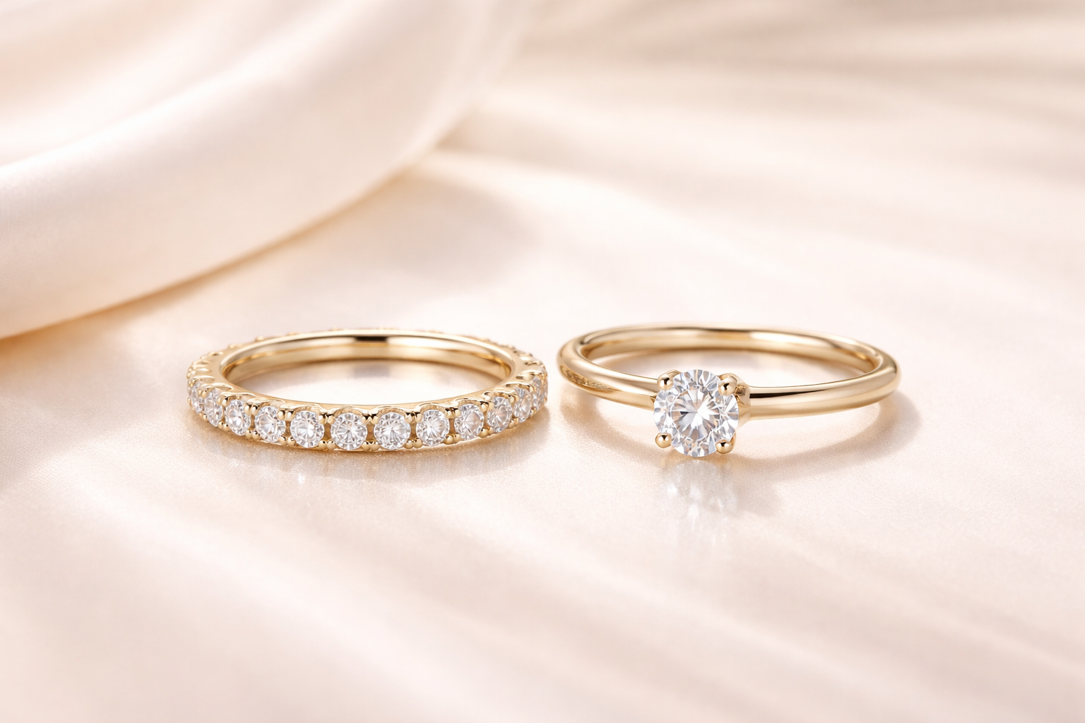 Gold Solitaire and Eternity Diamond Rings. Two luxurious gold rings: a solitaire engagement ring with a brilliant diamond and an 18K yellow gold eternity band set with round diamonds.